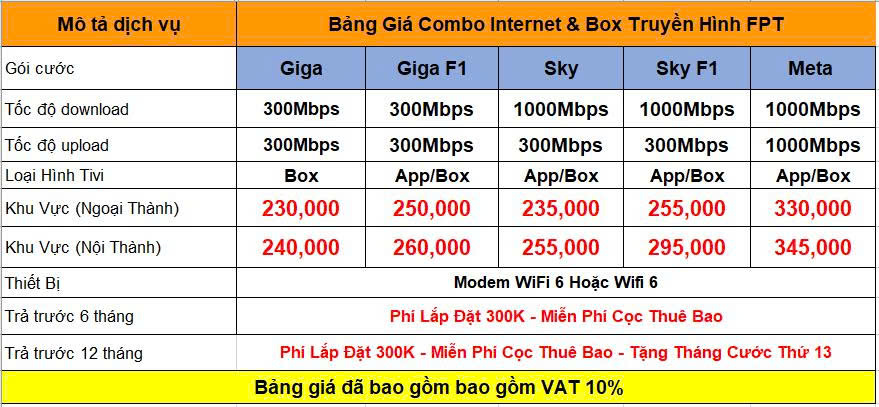 Bảng Giá Cước Cáp Quang và Truyền Hình FPT