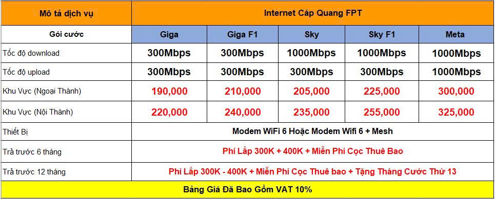 Bảng Giá Cước Cáp Quang FPT